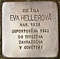 Eva Hellerová was born on 17 February 1938. Her parents were Dr. Arnošt Heller and Olga née Stutzová (see below).[7] Her last residence before deportation was in Prague X, Litomyšlská 5. On 22 December 1942, she and her mother were deported to Theresienstadt concentration camp by transport Ck. Their transport numbers were 809 and 810 of 1,005. They remained interned there for nearly two years. On 4 October 1944, she was deported to Auschwitz concentration camp by transport En. Their transport numbers was 1004 and 1105 of 1,500. There she was murdered by the Nazi regime at the age of 6. Also her mother died.[8][9]