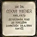 OSKAR WIENER BORN 1873 DEPORTED 1942 TO THERESIENSTADT MURDERED 20.4.1944 THERE |
