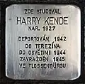Kende, HarryHarry Kende was born on 24 March 1927 in České Budějovice. On the 18 April 1942 he was deported in the wake of Transport Akb, Nr. 222 from České Budějovice to Theresienstadt concentration camp. From there, he was deported to Auschwitz concentration camp on 28 September by transport EK, Nr. 586. Later on he was brought to Flossenbürg concentration camp where he was murdered on 8 March 1945. The stumbling block is located in front of his former school building. Moreover, Vilém Kende (1883–1944) who was most likely Harry Kende's Uncle and his wife Valerie Kendeová (1888–1944) were also murdered in Auschwitz.[1][2][3][4]