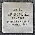 Metzl, ViktorViktor Metzl was born on 13 January 1903 in Třeboň. He was a lawyer and he married Marie Vlasimska. The couple had two children – Alena (born in 1932) and Nora Metzl (born in 1934). On 4 October 1944 Victor was arrested, and he was murdered on 7 April 1945 in Mauthausen concentration camp. His wife was arrested in December 1944. When the war had finished, she returned home to her daughters.