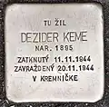 DEZIDER KEME BORN 1895 ARRESTED 11.11.1944 MURDERED 20.11.1944 IN KREMNICKA |