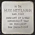 HUGO MITTELMANN BORN 1896 ARRESTED 27.3.1942 DEPORTED 1942 TO TREBILNKA MURDERED THERE |
