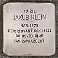 JAKUB KLEIN BORN 1878 DEPORTED IN 1944 TO AUSCHWITZ MURDERED THERE |