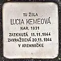 LUCIA KEMEOVÁ BORN 1931 ARRESTED 11.11.1944 MURDERED 20.11.1944 IN KREMNICKA |