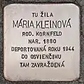 MÁRIA KLEINOVÁ NÉE KORNFELD BORN 1880 DEPORTED IN 1944 TO AUSCHWITZ MURDERED THERE |