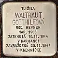 Horná Ulica 80/23 | Waltraut Eveline Gotthilfová née Hepner, called Traute, was born in 1906 in Obernigk near Breslau, then Germany. She married Ladislav Gotthilf, a physician. The couple had a son, Michal (see above). She was a housewife. Although Waltraut Gotthilfová was of German descent and of catholic faith and although both husband and son were baptized, the whole family was arrested in Harmanec on 10 November 1944. Ten days later, on 20 November 1944, father, mother and son were shot in the course of the Massacre of Kremnička.[5][6] |