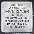 FRANZ KLAUSER BORN 1907 ARRESTED 8.1.1942 PENITENTIARY MANNHEIM DEAD 6.11.1944 IN LADELUND CONCENTRATION CAMP |