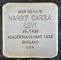 Margot Carola Levi was born in 1926 in Überlingen. Her parents were Viktor and Julie née Weil. She had an older sister named Hanny, born in 1924. After the pogrom of the so-called Kristallnacht in November 1938, her father was arrested and deported to Dachau concentration camp. He was set free under the condition that he would sell his house and his shop and emigrate with his family. Margot and her sister were sent to England with a children's transport. Hanny's parents and her grandfather Wilhelm managed to escape to England on 25 August 1939 where the family was reunited. The Levis emigrated to Louisville, Kentucky, where her grandfather died in 1952, her mother in 1971, her father in 1977 and her sister in 2007. Margot died in 2009. She had never came back to her home town. |
