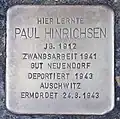 Paul Hinrichsen was born on 18 December 1912 in Leipzig. His parents were Henri and Martha Hinrichsen. His father conducted the Leipzig publishing house Musikverlag C. F. Peters. He had six siblings: the brothers Max, Hans-Joachim, Robert and Walter and the sisters Charlotte and Ilse. He studied agriculture, went to Brazil for a short time, and returned to Germany in 1930. Thereafter he lived in Berlin. In 1941, he was deported to a labor camp in Neuendorf (originally an institution of the Hachshara) near Fürstenwalde. On 19 April 1943, Paul Hinrichsen was deported from Berlin to Auschwitz concentration camp. There he was assassinated.
