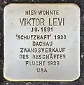 Viktor Levi was born in 1891. His parents were Wilhelm and Hannchen Levi. His father opened a textile store in Überlingen in 1891 in Münstererstraße 12. He was married to Julie née Weil. The couple had two daughters, Hanny Lore (born 1924) and Margot (born 1926). After the Reichskristallnacht, Viktor was arrested and deported to Dachau, where he was released on the condition that he would sell house and business and emigrate with his family. The daughters were able to flee to England with a children's transport. After the foreclosure sale (mayor Albert Spren noted in Stadtchronik: "with these sales the house ownerships in Überlingen became completely free of Jewish property"), where the property and the house went to the neighbors (who enlarged his café) also the warehouse had to be sold – to a competitor of ″Aryan″ origin. Viktor Levi, his wife and his fatherwere able to leave for England on 25 August 1939. Despite the sales they were left without assets, as most of the sales proceeds had to be paid to the Nazi regime for "Jewish property tax", the "Reichsfluchtsteuer", the "relocation tax" and other levies. In England, the family was able to reunite. The Levis migrated to Louisville (Kentucky), where Wilhelm Levi died in 1952, Julie in 1971 and Viktor in 1977. Hanny died in 2007 and Margot in 2009. |
