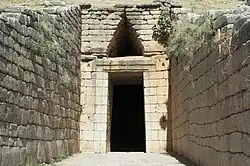 A stomion was a deep doorway of post and lintel construction that formed the entrance of Mycenaean megalithic structures particularly on tholoi or beehive tombs. Contrasting with the cyclopean masonry that formed the basis of much of Mycenaean construction, stomioi were formed of large ashlars. The ashlars are typically topped with a large corbelled relieving triangle which in the case of the Lion Gate at Mycenae contains a bas-relief carving. The stomion of a tomb is fronted by a dromos, a narrow passageway dug into the side of a hill.[1][2]
