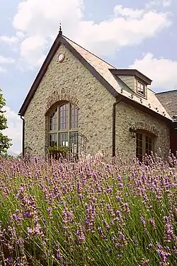 Built using white limestone, a traditional material commonly found in France and not native to the Eastern United States, a slate roof and post-and-beam construction gives this home the appearance of an old medieval structure when in fact it was completed in 2006. The exterior of the Stone Cottage uses a technique called "Slush & Brush" that was employed thousands of years ago, using a wood paddle instead of a trowel and not raking back the joints. The Stone Cottage is only 1,800 square feet (170 m2) and features an open plan Great Room where the kitchen, dining area and living room are located.