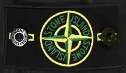 Stone Island is an Italian luxury fashion house specialised in men's apparel, outerwear, and accessories headquartered in Ravarino, Emilia-Romagna. Its core branding includes a nautical star and compass, both of which is printed or overlaid atop a button-on cloth badge with green, yellow, and black detailing.