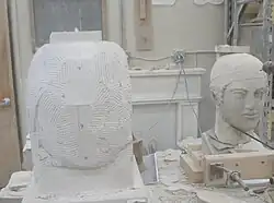 On the other hand, is the indirect method, when the sculptor begins with a clearly defined model to be copied in stone. The models, usually made of plaster or modeling clay, may be fully the size of the intended sculpture and fully detailed. Once the model is complete, a suitable stone must be found to fit the intended design.[4] The model is then copied in stone by measuring with calipers or a pointing machine. This method is frequently used when the carving is done by other sculptors, such as artisans or employees of the sculptor.