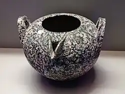"Elaborate stone vessels carved with repeating designs, both geometric and naturalistic, in an easily recognizable “intercultural style”,[3] were made primarily of chlorite; a number were produced at the important site of Tepe Yahya southeast of Kerman (Iran) in the middle and late 3rd millennium b.c.e. Some of these vessels were painted natural color (dark green) and inlaid with pastes and shell, and some have even been found with cuneiform inscriptions referring to rulers and known Sumerian deities. More than 500 vessels and vessel fragments[4] carved in this style have been recovered from sites ranging from Uzbekistan and the Indus Valley (e.g., Mohenjo-daro) in the east to Susa[5] and all the major Sumerian sites in Mesopotamia, including Mari, in the west and to the Persian Gulf, particularly Tarut[6] and the Failaka Islands, in the south."[7]