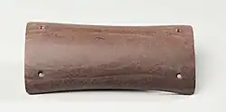 It was originally thought that these stone wrist-guards were bracers, used by archers to protect their bow arms from the string of the bow. However, recent research has highlighted that (in Britain at least) they do not commonly occur in graves in association with arrowheads (the Amesbury Archer being a notable exception), nor are they commonly found on the part of the arm that would need protection from the bowstring (on a right-handed archer, the inside left wrist).[3][4] However, of the 12 items identified as wrist-guards found in the burial ground in Holešov, in the Nitra culture graves most of them (7 of 9), and in the Bell Beaker culture graves some of them (1 of 3) were found in graves which also contained arrowheads.[5][6]