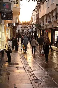 Stonegate is a street in the city centre of York, in England, one of the streets most visited by tourists. Most of the buildings along the street are listed, meaning they are of national importance due to their architecture or history.[1]