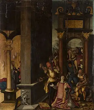 The painting had been badly damaged by the fire that broke out on 13 August 1947 in the Palais Rohan, reducing some works to ashes and disfiguring others through the intense heat and smoke. It was finally restored starting in 2021, and presented again to the public in 2022, 400 years after its creation and 75 years after its near-destruction. The painting is notable for its origin, having been commissioned by the cardinal Albert of Brandenburg, and for the presence of a self-portrait of the artist, sporting a moustache[3][4]