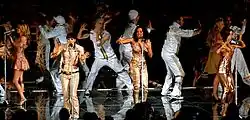 In October 1997, the group performed it as the ninth song of their first live concert at the Abdi Ipekçi Arena in Istanbul, Turkey. The performance was broadcast on Showtime in a pay-per-view concert special titled Spice Girls in Concert: Wild!.[57] However, the VHS and DVD release of the concert, Girl Power! Live in Istanbul, does not include the "Stop" performance.[58] In November 2007, the group performed together for the first time in nearly a decade at the 2007 Victoria's Secret Fashion Show, held in Los Angeles, California. The group dressed in military-themed outfits performed "Stop" miming to a backing track, in front of giant glittering lights that spelled out "Spice" in the background.[59] A taped performance of the group lyp-synching the song, while dressed in blue sailor outfits, aired on 17 November 2007 for the Children in Need 2007 marathon.[60] On 8 November 2010, Brown performed "Stop" with the second series' contestants of the Australian edition of The X Factor.[61]