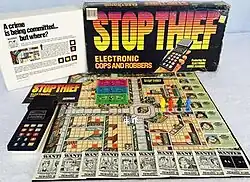 Stop Thief is an American-originated electronic board game published by Parker Brothers. It was released in 1979.[1][2] In 2016, Restoration Games announced that they were bringing back a restored version of the game, using a free smartphone companion app in place of the electronic device. On April 11, 2017, they successfully funded a Kickstarter campaign for the game.[3]
