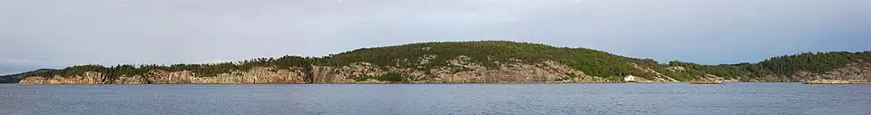 Stora Bornö is about 4 km (2.5 mi) long from north to south and is largely covered with pine forests. The island's highest point is 110 m (360 ft) above sea level and in many places the shoreline consists of vertical cliffs.[1]