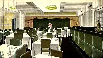 Billingsley's original plan for the Cub Room was for it to be a private place for playing gin rummy with his friends.[note 14][57] The room was added to the club during World War II. Billingsley broke out a wall in the bar to create this private space, but it was Walter Winchell who began to call it the Cub Room.[95][6] The Cub Room had no windows and was described in a Louis Sobol column as a "lopsided oval". The room was lit with pink tones. On the wood-paneled walls were paintings of beautiful women; Billingsley also had similar portraits by the same artist in the ladies' powder room.[36][96][note 15] After the club's labor problems began in 1957, Billingsley redecorated the entire club, choosing emerald green for the carpet and chairs, and a pinkish-red for the banquettes. The Cub Room's wood panels were replaced by beige burlap and the portraits of beautiful women were replaced by paintings of noted 19th-century race horses.[97] As a concession to those who wanted to have a business lunch at The Stork, the Cub Room was for men only during lunch time.[98][note 16] The sanctum sanctorum, the Cub Room ("the snub room"), was guarded by a captain called "Saint Peter" (for the saint who guards the gates of Heaven).[94][80]