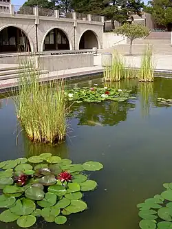 The Plaza houses the university paper (the Daily Nexus), the radio station (KCSB-FM), and the yearbook office (La Cumbre Yearbook); the top of the tower supports cell phone signal transmitters and a KCSB radio antenna.[11] The open-air area of the Plaza contains a large rectangular pond that functioned as a reflecting pool until 2003, when it was transformed into a cost-saving and partially self-sustaining aquatic ecosystem[12] including koi and water lilies.[13]
