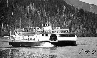 Storm King was named after a mountain overlooking the lake. Storm King was driven by sidewheels.. On deck, the vessel was 112' long and measured 31.5' on the beam across the sidewheels. (The hull measurements were 90' long, 20.5' on the beam.)[1] Storm King, powered by a 40 horsepower (30 kW) Fairbanks-Morse engine, was probably the largest vessel ever on Lake Crescent.[1] The ferry had a capacity of 21 automobiles and 150 people.