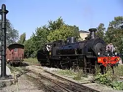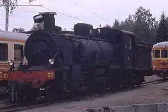 Transporter wagons were introduced in freight trains from Uppsala to Norrtälje and Hallstavik in 1955, enabling direct transports to the normal-gauge network.[3]: 79 This caused a large increase in freight traffic via Uppsala, and SRJ 27–29 were generally used in these trains.[3]: 79 Smaller steam locomotives hauling trains with transporter wagons were prone to get stuck at a gradient near Faringe.[3]: 192 Diesel locomotives were however introduced during the 1950s, and steam locomotives were hardly ever seen on the Uppsala–Rimbo line after 1958,[3]: 83 but SRJ 28 was used on the line to Hallstavik until the autumn of 1960.[3]: 84 That locomotive was then preserved in Faringe[3]: 87 before being transferred to the Swedish Railway Museum in 1970.[1]: 221 It was returned to Faringe in 1987 on loan to the heritage railway Upsala-Lenna Jernväg.[3]: 107 The other two locomotives were scrapped in 1962.[1]: 221