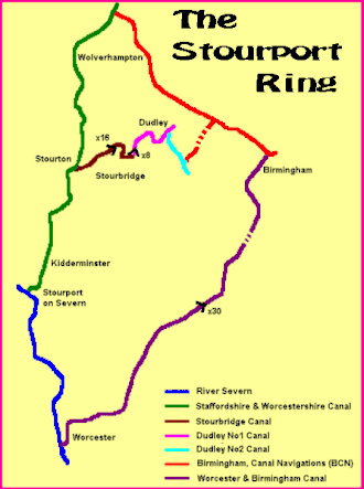 The Stourport Ring is a connected series of canals forming a circuit, or canal ring, around Worcestershire, The Black Country and Birmingham in The Midlands, England. The ring is formed from the River Severn, the Staffordshire and Worcestershire Canal, the Stourbridge Canal, the Dudley Canals, the Birmingham Canal Navigations (Netherton Tunnel Branch Canal and Birmingham New Main Line) and the Worcester and Birmingham Canal.