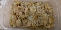 The potatoes are cooked by slow stewing in a closed pot with fat (lard, beef dripping or butter)[1][5] and often a small amount of water[1] or other liquids, such as milk, stock or meat jelly.[1][4] Stovies may be served accompanied by cold meat[1] or oatcakes[6][7][8][9][10] and, sometimes, pickled beetroot.[11][12]