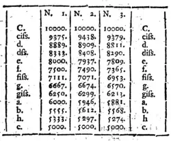 Both articles were reproduced in a German edition of the Academy's proceedings published in 1751,[16] and a table of Faggot's calculated string lengths was subsequently included by Marpurg on his 1776 Versuch über die musikalische Temperatur,[1] who wrote that he accepted their accuracy but that rather than accomplishing "Strähle"'s stated goal, the tuning represented an unequal temperament "not even of the tolerable type."c
