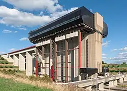 The Strépy-Thieu boat lift (French: L'ascenseur funiculaire de Strépy-Thieu) lies on a branch of the Canal du Centre in the municipality of Le Rœulx, Hainaut, Belgium. With a height difference of 73.15 metres (240.0 ft) between the upstream and downstream reaches, it was the tallest boat lift in the world upon its completion in 2002, and remained so until the Three Gorges Dam ship lift in China was completed in January 2016.
