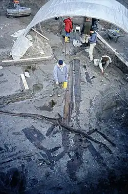 The three dugout canoes found in this excavation are the oldest watercraft yet found in northern Germany. The boats were made from two-inch thick shells of linden wood. Two of them date to around 5000 BC. The third dates to 4,000 BC. It is possible that the settlement had been destroyed by a sudden flood. Masses of earth had fully covered the dugouts and conserved the organic remains from the Stone Age to the present day. Four people would have fitted in the largest dugout, which was 60 cm wide and 12 metres long.[2] The material of the boats is comparable to the Mesolithic boats found at Tybrind vig in Denmark.