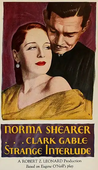 Strange Interlude is a 1932 American pre-Code drama film directed by Robert Z. Leonard and released by Metro-Goldwyn-Mayer. The film stars Norma Shearer and Clark Gable, and is based on the 1928 play Strange Interlude by Eugene O'Neill. It is greatly shortened from the play: the stage production lasts six hours and is sometimes performed over two evenings, while the film runs for two hours.