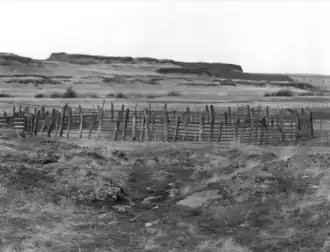 The Strap Iron Corral, located about 5.8 miles (9.3 km) north of Hooper, Washington, is a historic corral built in the 1870s by "Uncle Jim" Kennedy.[2][3] It was constructed of native rough-hewn lumber connected by 2.38-inch iron straps, once used as a cap for wooden rails of the Columbia River Railroad. This was converted to solid iron rails in 1875, and at least some of the straps were sold to Kennedy.[4]