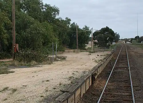 Strathmerton has a disused and run-down platform, and two disused home signals for up trains at the down end of the station. The points for the Cobram line have been lifted, with freight trains continuing to use the line north to Tocumwal.