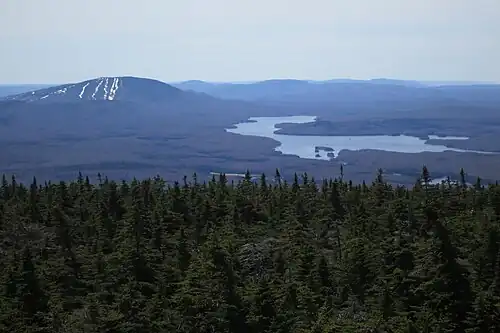 The mountain has two peaks, of which the southern one is the highest, at 3940 feet. The mountain ridge descends to northward to a saddle at 3830 feet, before rising to the north peak at 3875 feet. The south summit is wooded, except for the small clearing housing the tower and caretaker's cabin. The Stratton Mountain Lookout Tower was built about 1934 by a crew of the Civilian Conservation Corps, and the cabin dates to about 1970. The tower is the subject of a 1992 listing on the National Register of Historic Places, as one of the state's last surviving towers, and one of the last three to be taken out service for fire spotting (in 1982).[1]