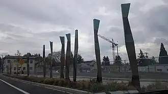 Stratum is a public art installation consisting of 23 multicolored sculptures, or "ecologically inspired geological totems", along the east approach to the Sellwood Bridge in southeast Portland's Sellwood neighborhood. The totems are 14 feet (4.3 m) tall and made of layered recycled materials intended to "create a surface representing earth, water and sky as a gateway to the Sellwood community".[1] They "rotate" at 90-degree angles. According to the Regional Arts & Culture Council, the project's concept was "driven by the power and beauty of the geologic and natural phenomena" of the Willamette Valley. It was funded by the City of Portland's art program. The sculptures are owned by the city and maintained by the Regional Arts & Culture Council.[1][2]