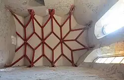 The chapel was built in the first half of the 15th century in the era of Sigisbund of Luxemburg´s second wife Barbara of Cilli´s ownership. It bound to the northern wall of the palace. Originally, it was nave not-vaulted object with beamed ceiling. It was vaulted with a stellar rib vault with a wedge-profiled rib later in the 15th century. Only original parts of the vault are capitals, rest of the vault was rebuilt during a reconstruction in the second half of the 20th century with original stone elements found by archaeologist and with new ones. The light passes into the object through two original gothic windows located in the eastern part of the chapel, behind the altar. In the past, there were two wooden platforms connected with a wooden stair in the western part of the chapel. These platforms were providing access to the chapel. The chapel was accessible from the northern palace and from the northern tower on the third floor level. Main entrance to the chapel was placed in the south wall at the second floor level. At the level of the first floor, there is a small orthogonal sacristy adjacent to the southern wall of the chapel. In the past, this room was vaulted with a barrel vault.