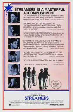 Streamers is a 1983 American war drama film directed and produced by Robert Altman, adapted by David Rabe from his play of the same name. It stars an ensemble cast, featuring David Alan Grier, Mitchell Lichtenstein, Matthew Modine, Michael Wright, George Dzundza, and Guy Boyd.