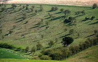 There is evidence discovered that the terracing formed on the site is of Iron Age creation, when an archaeological dig was started on the site in 1948.[5] It is also believed that Romans continued to use this land for farming.[5] During medieval times the land was used for farming rabbits.[6]