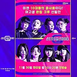 Street Dance Girls Fighter (Korean: 스트릿댄스 걸스 파이터) is a spin-off of South Korean dance survival program Street Woman Fighter that premiered on Mnet on November 30, 2021 and aired every Tuesday at 22:20 KST. Female dance crews composed of high school-aged girls compete to become the top teenage dance crew.[1] The winning crew receives a ₩10,000,000 scholarship, an opportunity to serve as an advertising model for financial services for teens, and the Street Dance Girls Fighter Trophy.[2][3]