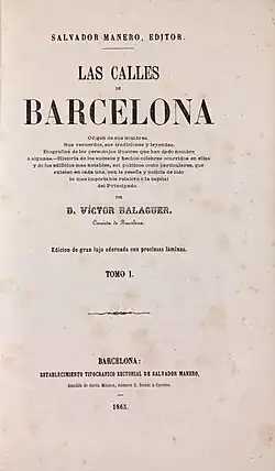 Influenced by romantic historiography, Balaguer introduced numerous Catalanist names, opening the door for numerous Catalan towns that followed suit.[75] He created several streets named after territories linked to the Crown of Aragon: Valencia, Mallorca, Aragon, Provence, Roussillon, Naples, Calabria, Corsica, Sicily, and Sardinia; institutions such as the Catalan Courts, the Catalan Parliament, the Diputation, or the Council of One Hundred; characters from politics, literature or the Catalan arts: Balmes, Aribau, Muntaner, Casanova, Pau Claris, Roger de Flor, Villarroel, Roger de Lauria, Count Borrell, Count of Urgel, Entenza, Ausiàs March, Llull, Llança, Alí Bey, Manso, Pallars, Pujades, Rocafort, Tamarit, Viladomat, Vilanova or Vilamarí; battles and historical events, such as Bailén, Lepanto, Bruc or Caspe.[76] He also dedicated streets to Industry, the Navy and Commerce, and to the Catalan cities of Gerona and Tarragona.[77] There were some modifications to his initial proposal, such as the street of the university, which in 1916 was changed to Enrique Granados after the composer's death; and some names that finally did not materialize, such as Atenas, Desclot, Barceló, Capmany, La Coronela and Llobregat.[78]