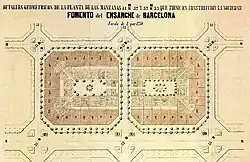 Thanks to the demolition of the medieval walls in 1854, the city was able to expand on the adjacent plain.[71] In 1859 the City Council appointed a commission to promote a competition for enlargement (eixample) projects, which was won by Antoni Rovira i Trias; however, the Ministry of Development intervened and imposed the project of Ildefonso Cerdá, author of a topographical plan of the Barcelona plain and a demographic and urbanistic study of the city (1855). The Cerdá Plan (Plan de los alrededores de la ciudad de Barcelona y del proyecto para su mejora y ampliación, 1859) instituted an orthogonal layout between Montjuïc and the Besós river, with a system of rectilinear streets oriented northwest-southeast, 20 m wide, cut by others oriented southwest-northeast parallel to the coast and the Collserola mountain range. Thus a series of square blocks of 113.3 m on each side were delimited, of which Cerdá planned to build only two sides and leave the other spaces for gardens, although this point was not fulfilled and finally practically all the buildable land was used; the buildings were designed with an octagonal floor plan characteristic of the Eixample, with chamfers that favored circulation.[72]