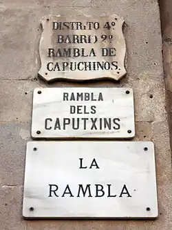 Between 1776 and 1778 the urbanization of la Rambla was carried out, an ancient torrent that during the Middle Ages marked the western boundary of the city, which had been populated since the 16th century, mainly by theaters and convents. At this time the inner wall was demolished, the buildings were realigned and a new landscaped promenade was designed, in the style of the French boulevard.[52] La Rambla has different names for each of its sections, so it is also often referred to in the plural, Les Rambles. From the Plaça de Catalunya to the Portal de la Pau, it is called: Rambla de Canaletes, after the water pipes of the Sant Sever reservoir; dels Estudis, after the old university or Estudi General; de Sant Josep, after the Carmelite convent of Sant Josep, located on the present site of the Boquería market; dels Caputxins, after the convent of the Capuchins of Santa Madrona, which was in the area of the present Plaça Reial; and de Santa Mònica, after the church of the same name. The term rambla comes from the Arabic ramla (رملة), which means "sandbank" — or intermittent watercourse — and has since been used as a generic for numerous thoroughfares in the city: Badal, Brasil, Caçador, Carmel, Catalunya, Fabra i Puig, Guipúscoa, Mar, Onze de Setembre, Poblenou, Prat, Prim, Raval and Volart.[53]
