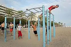 Street workouts are a physical activity performed in outdoor parks or public facilities. The movement behind street workouts became popular in Russia, Israel, Myanmar, Morocco, Uzbekistan, Eastern Europe, and the United States, especially in New York City, Los Angeles, Chicago, Philadelphia, Miami, Baltimore, Washington, D.C., and other urban East Coast neighborhoods.[1][2][3][4][5][6][7] It is a combination of athletics, calisthenics, and sports.[8] "Street workout" is a modern name for calisthenics (or bodyweight workouts) in outdoor parks. There are also street workout teams and organized competitions for exercises such as pull-ups, chin-ups, push-ups, dips, rows, muscle-ups, sit-ups and squats. A street workout also involves static (isometric) holds such as the human flag, front lever, back lever, L-sit and planche.[9]