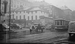 To relieve traffic congestion, the newly established Montreal Transportation Commission decided to convert the inner city routes first. Many of Montreal's streetcar routes included running on a portion of Sainte Catherine Street (Rue Sainte-Catherine) downtown. On some downtown sections of this street, there was a headway of 10 seconds or less between streetcars but by the end of August 1956, streetcar service on the street had come to an end. A parade of streetcars and historical equipment was held to commemorate the event. Many of the outlying routes, especially those running on private rights-of-way, lasted the longest. The city's last streetcars operated on August 30, 1959, after which Montreal was served solely by buses until the Metro opened in October 1966.[1] A parade similar to the one in 1956 was held to mark the occasion. A four-route network of electric trolley buses continued operating until 1966 at which point they were converted to Diesel.
