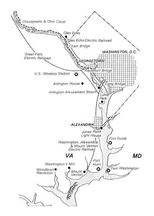 The Washington, Alexandria, and Mount Vernon Electric Railway began operating between Alexandria and Mount Vernon in 1892. On August 23, 1894, it was given permission to enter the District of Columbia using a boat or barge, but never did.[39]