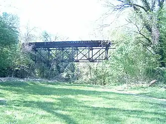 The railroad completed its tracks in 1896 and began serving a waiting station at 14th Street NW and B Street NW. From the waiting station it used the Belt Line Street Railway Company's tracks on 14th Street NW to reach the Long Bridge, a combined road and rail crossing of the Potomac River.[39] In 1906, the Long Bridge's road and streetcar tracks were moved to a truss bridge (the Highway Bridge), immediately west of the older bridge.[39][40] This span was removed in 1967.[41]